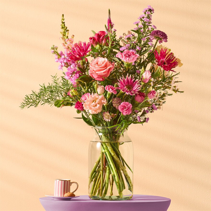 Dit prachtige boeket bestaat uit de mooiste bloemen in rozetinten en is hiermee het perfecte cadeau om een dierbare mee te verrassen. De speelse en luchtige stijl in combinatie met dagverse seizoensbloemen maakt van dit boeket een ware favoriet. Een bijzo