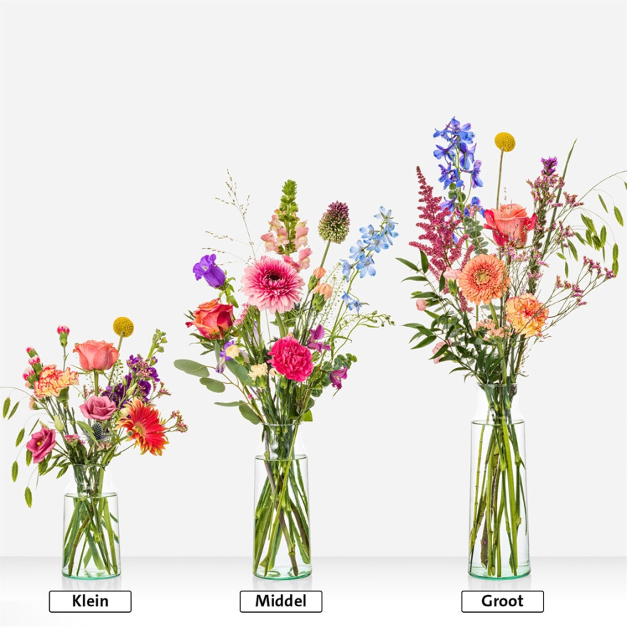 Vaasverrassing bont is de ultieme verrassing en wordt persoonlijk samengesteld door de Fleurop bloemist. De vaasverrassing is een combinatie van een moderne vaas beschikbaar in 3 formaten - klein, middel en groot - met mooie verse seizoensbloemen. De bloe