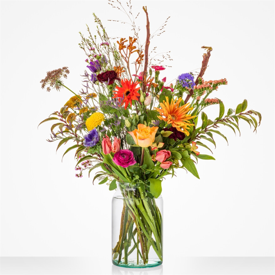 Haal de warmte in huis met dit bonte boeket vol kleur. Een absolute aanrader en rijkelijk gevuld met de mooiste seizoensbloemen in de meest uiteenlopende tinten. Voor de perfecte match bestel je de Fleurop Perfect Vintage medium vaas bij dit boeket. Of ga