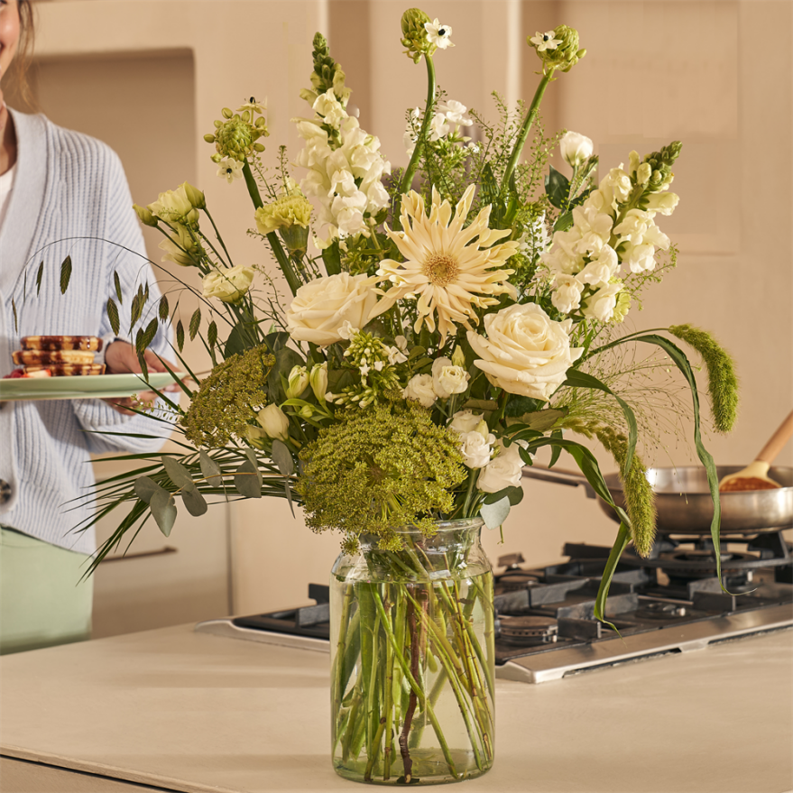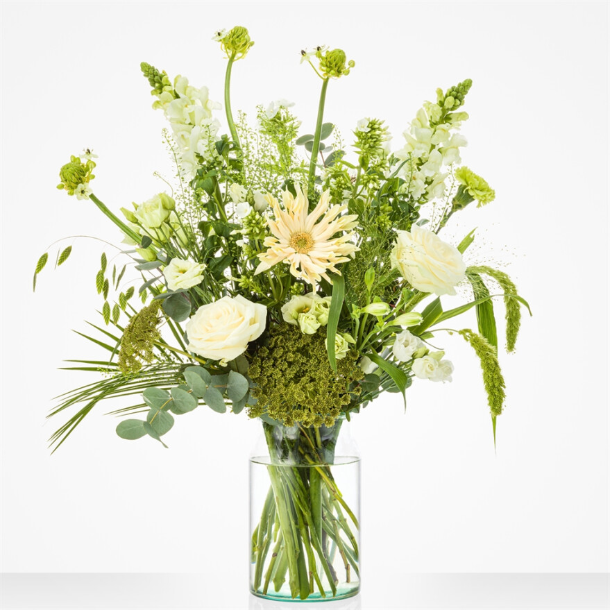 Het boeket Mooi wit is een prachtig boeket met de mooiste witte bloemen van dit seizoen. Het boeket bevat onder meer een Gerbera, Leeuwenbek en Ornithogalum en is een echte eyecatcher door de combinatie van verschillende wittinten.Ons witte boeket is de