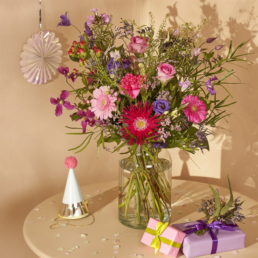 Een verjaardag is hét moment om iemand te verrassen met een vrolijk boeket. Fijne verjaardag is een prachtig boeket met roze en pasteltinten De opvallende gerbera en roos maken van dit boeket een waar plaatje om naar te kijken. Het perfecte cadeau om iema