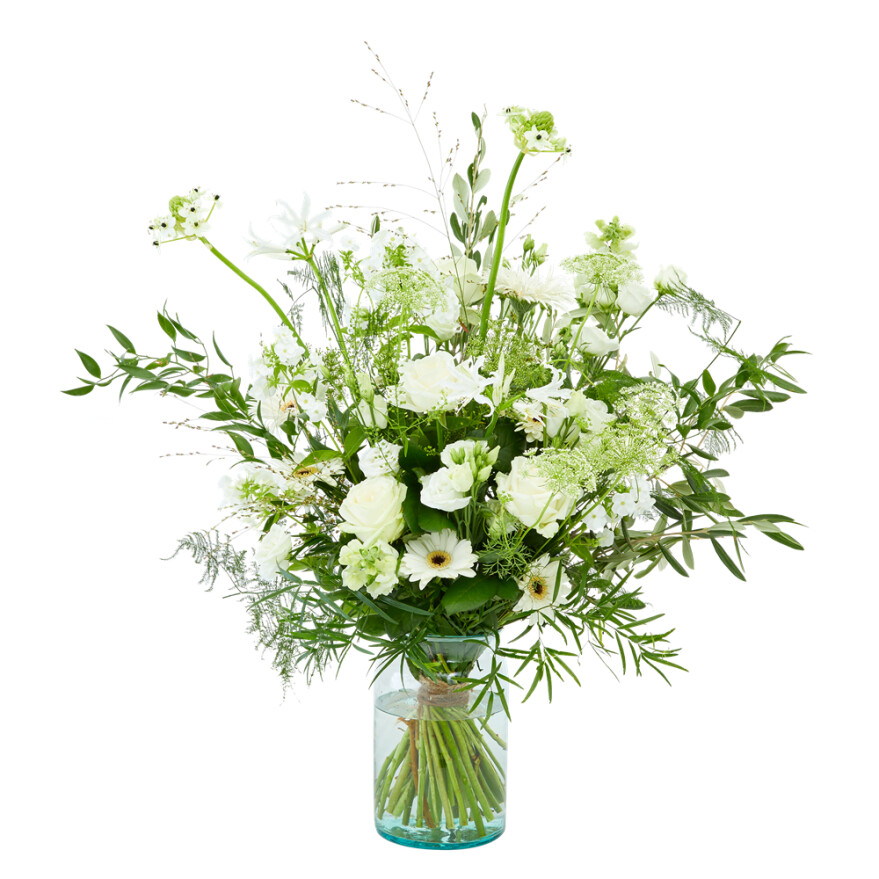 Het rouwboeket Elegant is een luchtig en modern witkleurig boeket. Elegant bestaat uit verschillende witte bloemen en heeft een klassieke en tijdloze uitstraling waardoor het rouwboeket geschikt is voor elk afscheid. Verkrijgbaar in drie formaten. Exclusi