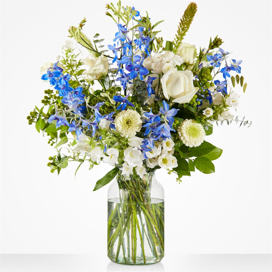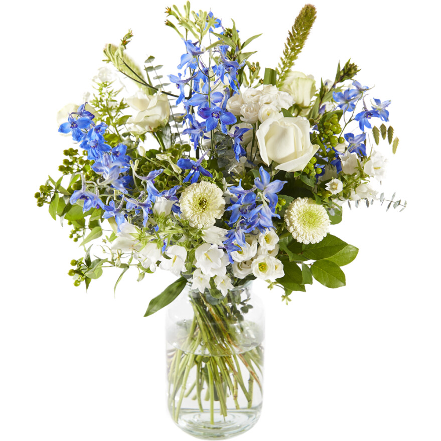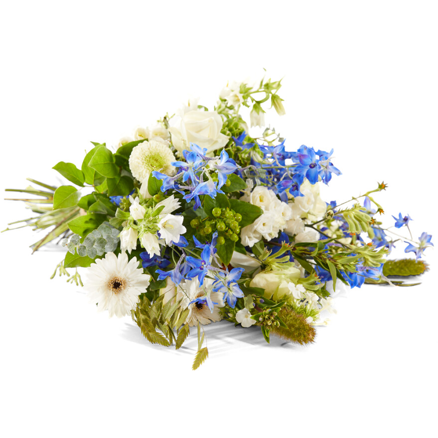 Een mooi sterkteboeket, gebonden met witte en blauwe bloemen. Hiermee geef je steun, liefde en een blijk van medeleven om iemands verdriet te verzachten. Dit boeket wordt gebonden om in een vaas te worden gezet. Mocht je niet zeker weten of het uitvaartce