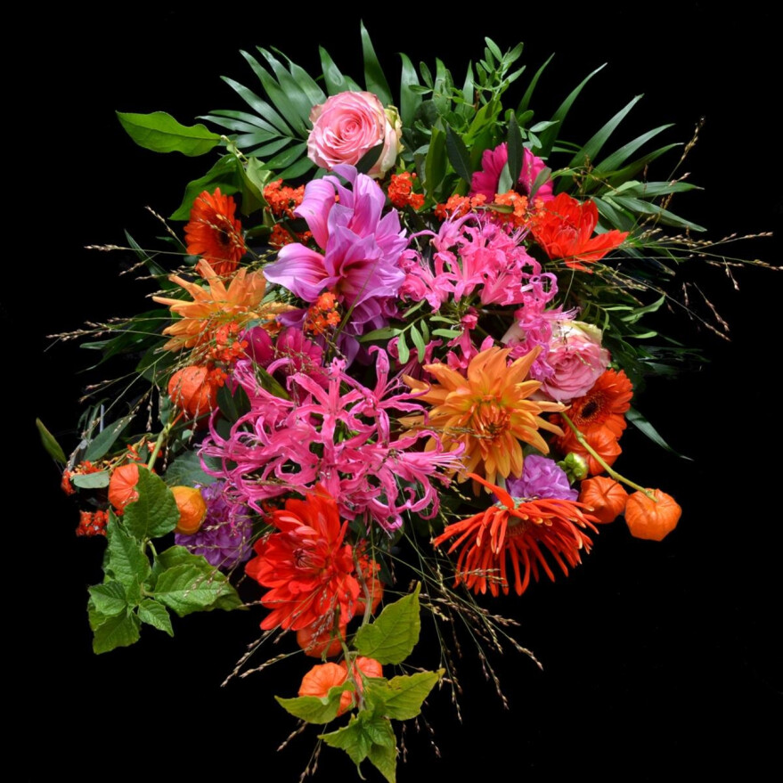 Dit liggende boeket is met veld achtige bloemen in felle kleuren samengesteld.